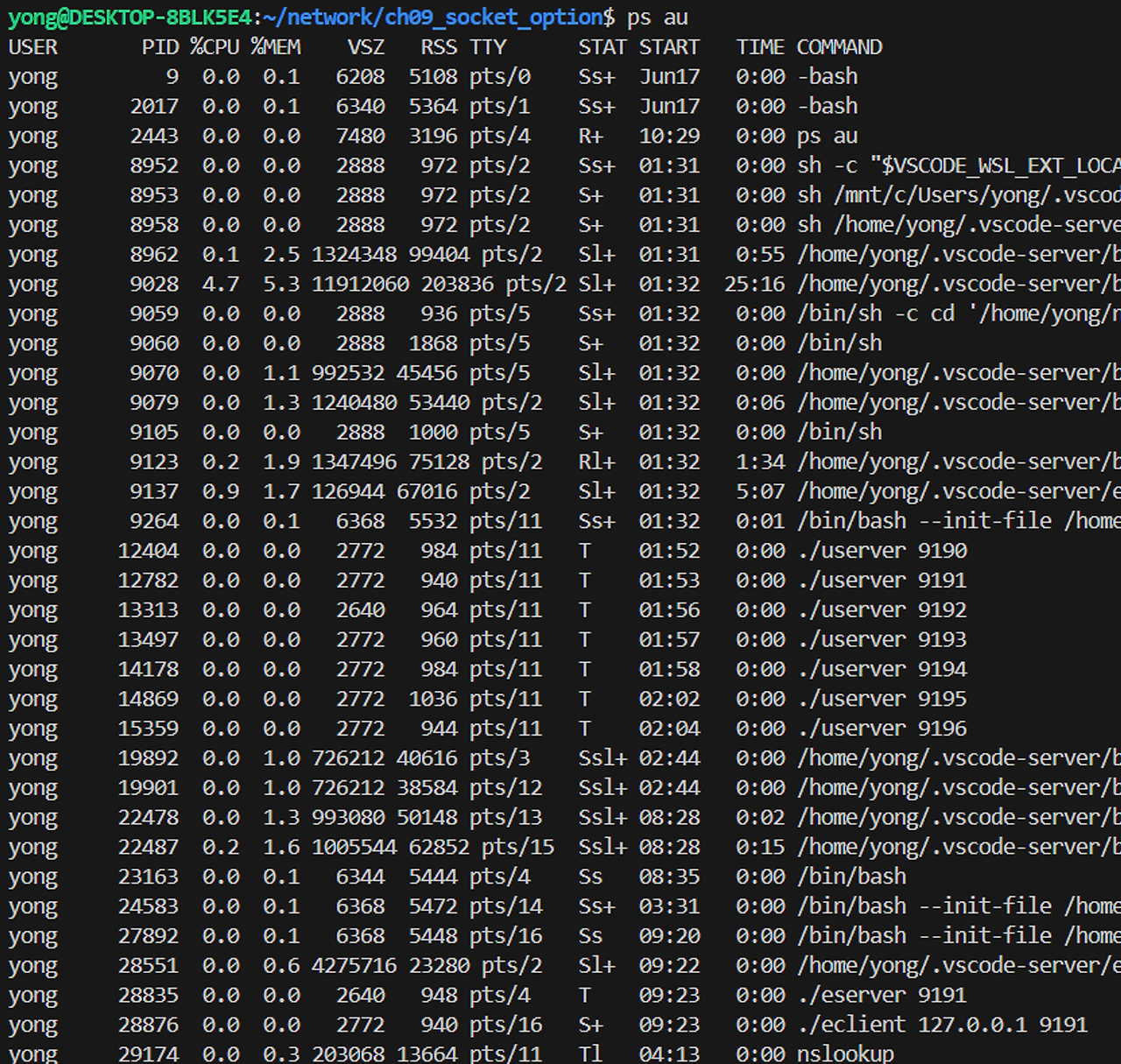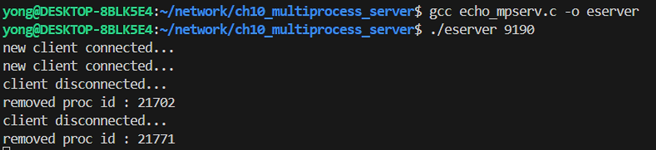 멀티 프로세스 기반 에코 서버 예제의 실행 결과는 아래와 같다.