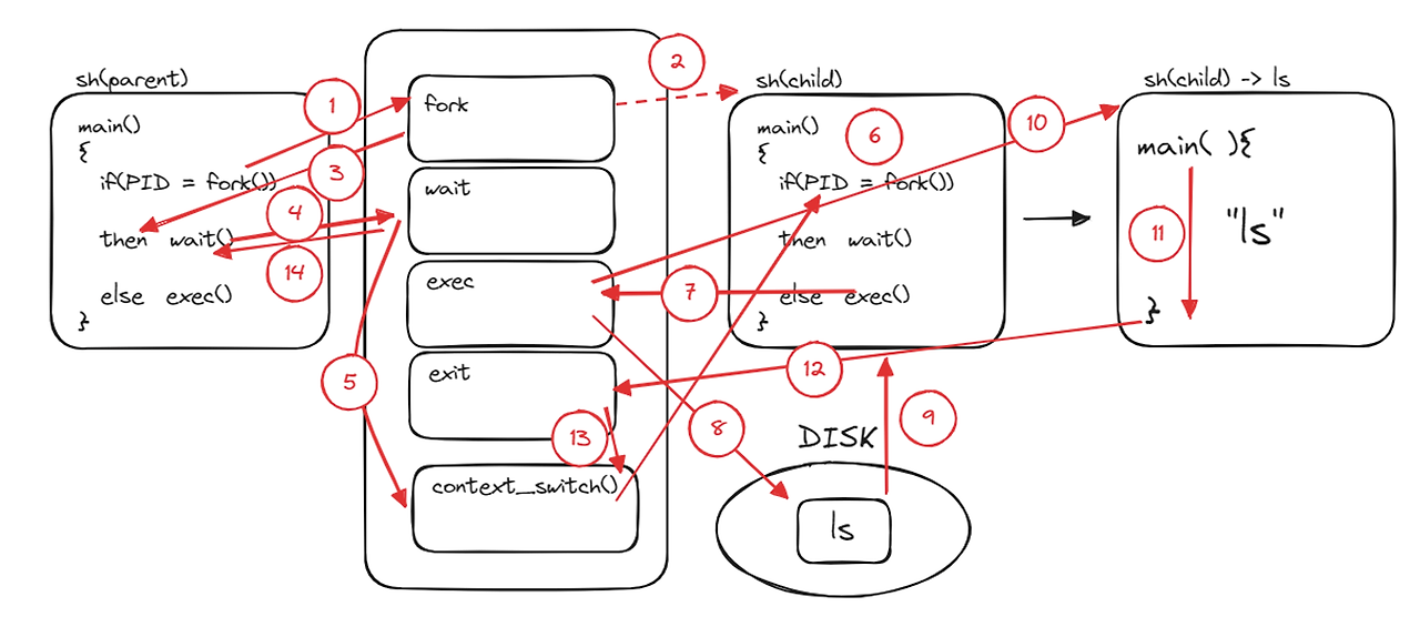 - exec( )을 호출하면 디스크에서 “ls” 파일을 찾아오게 되고,